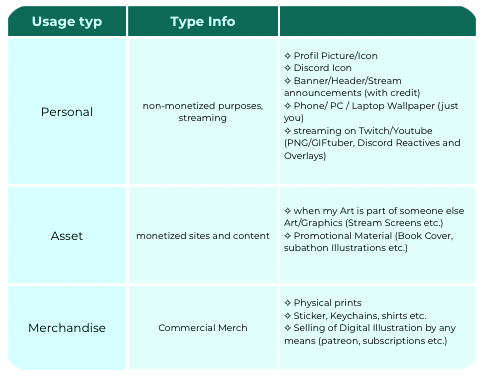 All commissions are personal use by default. This means you can use it on your social Media Platforms, in your streams and videos. Adding a usage to a commission can be done at any time. Please contact me if necessary. If the work needs to be modified in any way for a commercial use let me know.
